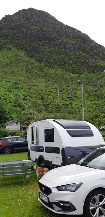 På Goksöyr camping på Runde ser föreståndaren till att alla får plats. Här campar vi med utsikt över Nordsjön.