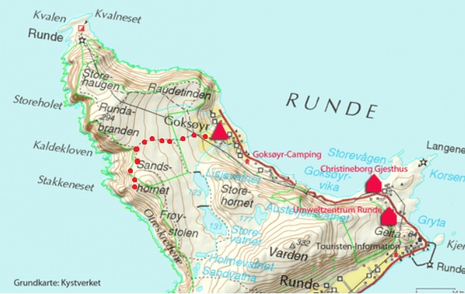 Stigen upp till lunnefåglarna markerad med röda prickar.