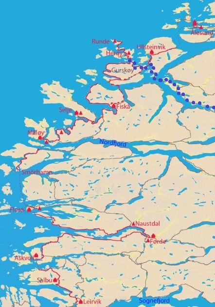 Runde ligger strax söder om Ålesund längst upp på kartan. Färden dit från Stryn markerad med blå prickar.